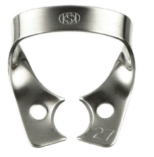Кламп для Раббердама 27 DENTECH устанавливается на премоляры обеих челюстей и подходит для сильно разрушенных зубов. Воронкообразные щечки идеально удерживают его на зубе, а отсутствие медиальных крыльев улучшает обзор.