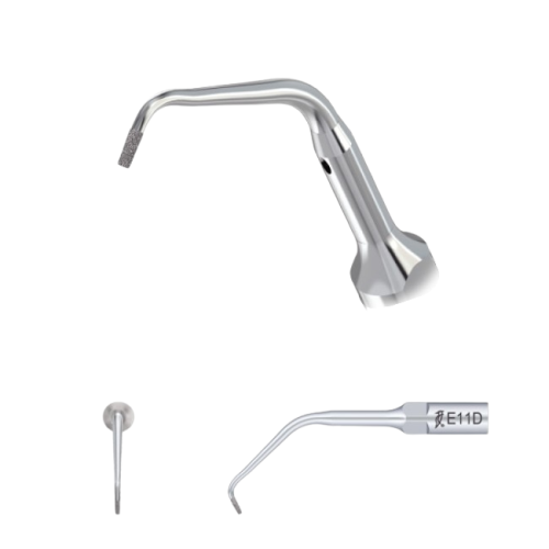 Насадка для скалера Е11D имеет алмазное напыление рабочей части фракции 40 мкм, что существенно облегчает обработку. Рабочая часть насадки длиной в 2,2 мм изогнута под удобным углом, что позволяет применять ее в любой части ротовой полости.
